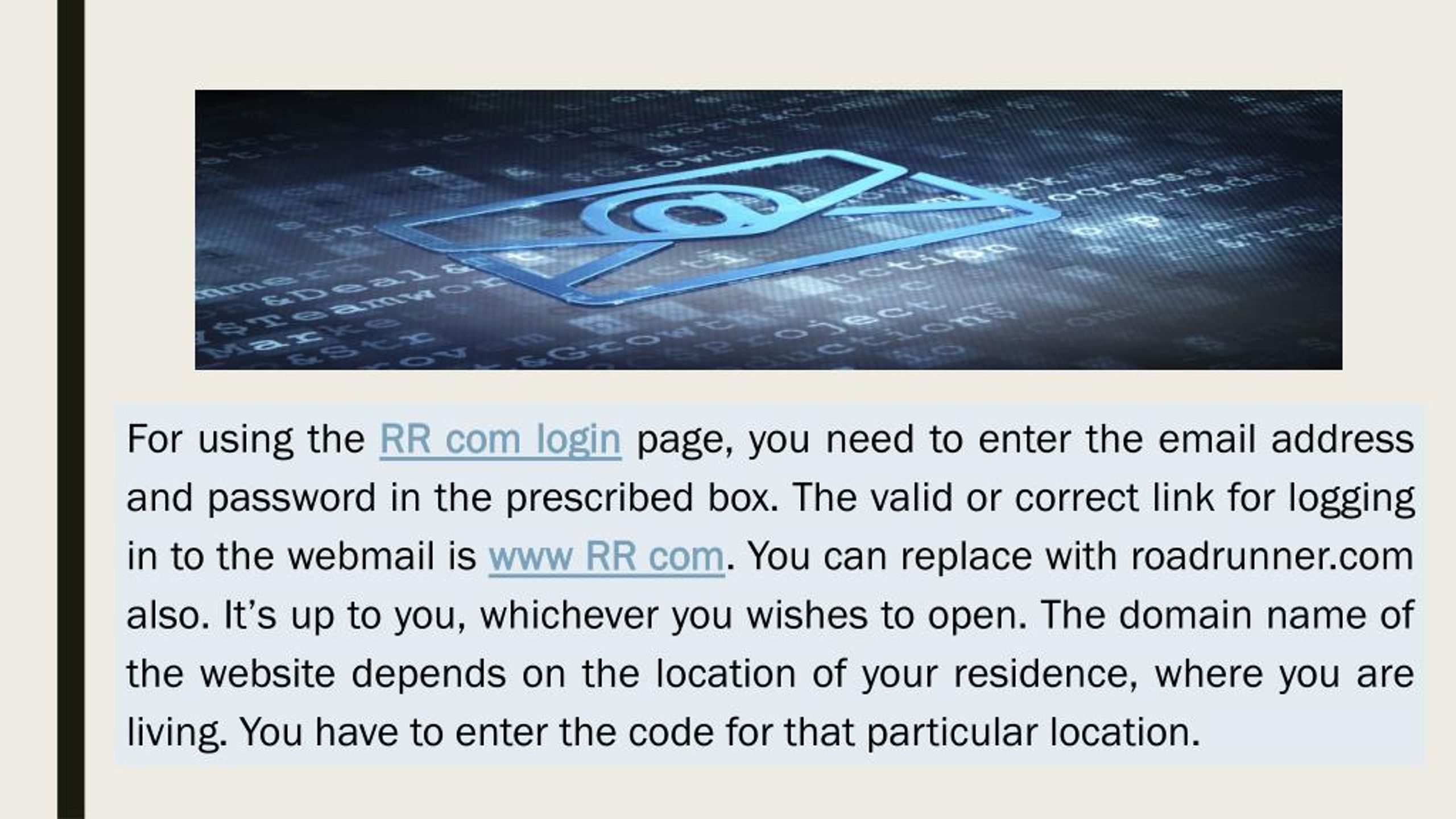 For using the RR com login page, you need to enter the email address and password in the prescribed box. The valid or correct link for logging in to the webmail is www RR com. You can replace with roadrunner.com also. It’s up to you, whichever you wishes to open. The domain name of the website depends on the location of your residence, where you are living. You have to enter the code for that particular location.
