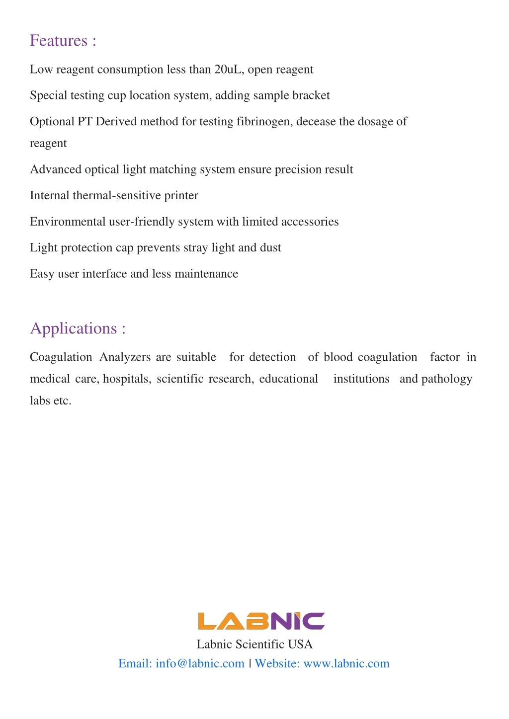 Features : Low reagent consumption less than 20uL, open reagent Special testing cup location system, adding sample bracket Optional PT Derived method for testing fibrinogen, decease the dosage of reagent Advanced optical light matching system ensure precision result Internal thermal-sensitive printer Environmental user-friendly system with limited accessories Light protection cap prevents stray light and dust Easy user interface and less maintenance Applications : Coagulation Analyzers are suitable for detection of blood coagulation factor in medical care, hospitals, scientific research, educational institutions and pathology labs etc. Labnic Scientific USA Email: info@labnic.com | Website: www.labnic.com
