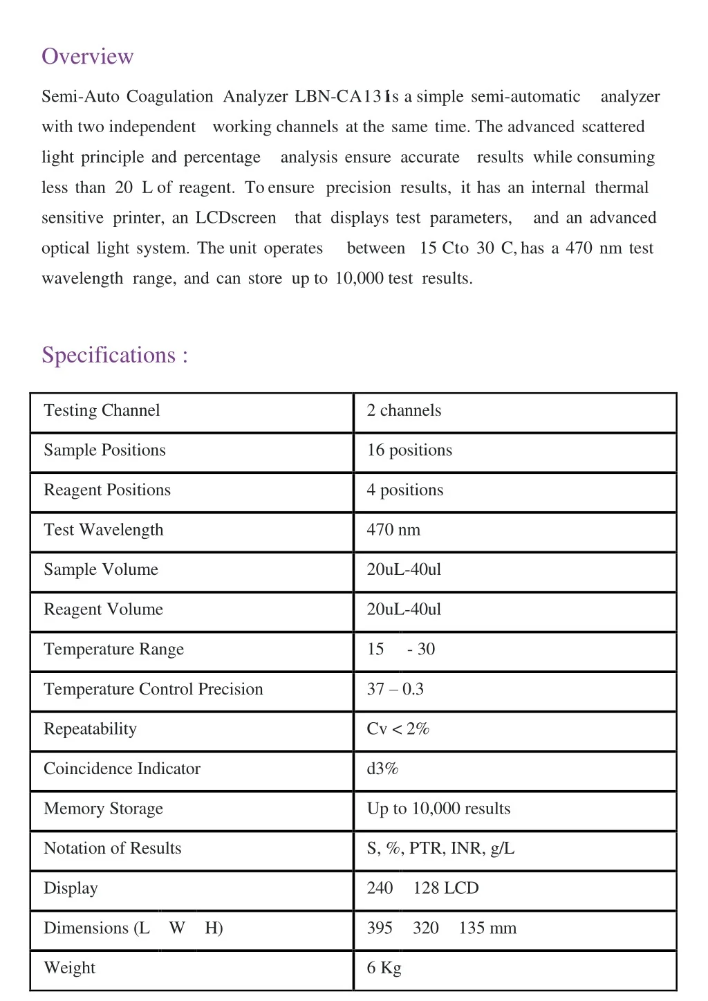 Overview Semi-Auto Coagulation Analyzer LBN-CA131 is a simple semi-automatic analyzer with two independent working channels at the same time. The advanced scattered light principle and percentage analysis ensure accurate results while consuming less than 20 L of reagent. To ensureprecision results, it has an internal thermal sensitive printer, an LCDscreen that displays test parameters, and an advanced optical light system. The unit operates between 15 Cto 30 C, has a 470 nm test wavelength range, and can store up to 10,000 test results. Specifications : Testing Channel 2 channels Sample Positions 16 positions Reagent Positions 4 positions Test Wavelength 470 nm Sample Volume 20uL-40ul Reagent Volume 20uL-40ul Temperature Range 15 - 30 Temperature Control Precision 37 – 0.3 Repeatability Cv < 2% Coincidence Indicator d3% Memory Storage Up to 10,000 results Notation of Results S, %, PTR, INR, g/L Display 240 128 LCD Dimensions (L W H) 395 320 135 mm Weight 6 Kg