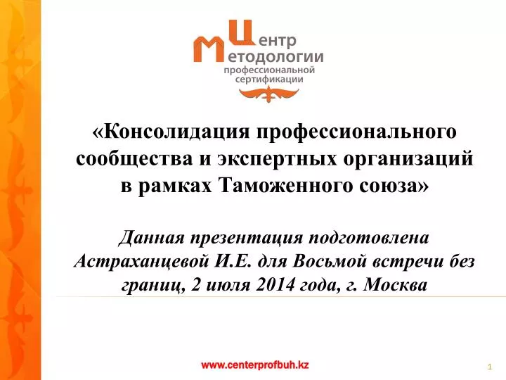 «Консолидация профессионального сообщества и экспертных организаций в рамках Таможенного союза» Данная презентация подготовлена Астраханцевой И.Е. для Восьмой встречи без границ, 2 июля 2014 года, г. Москва www.centerprofbuh.kz
