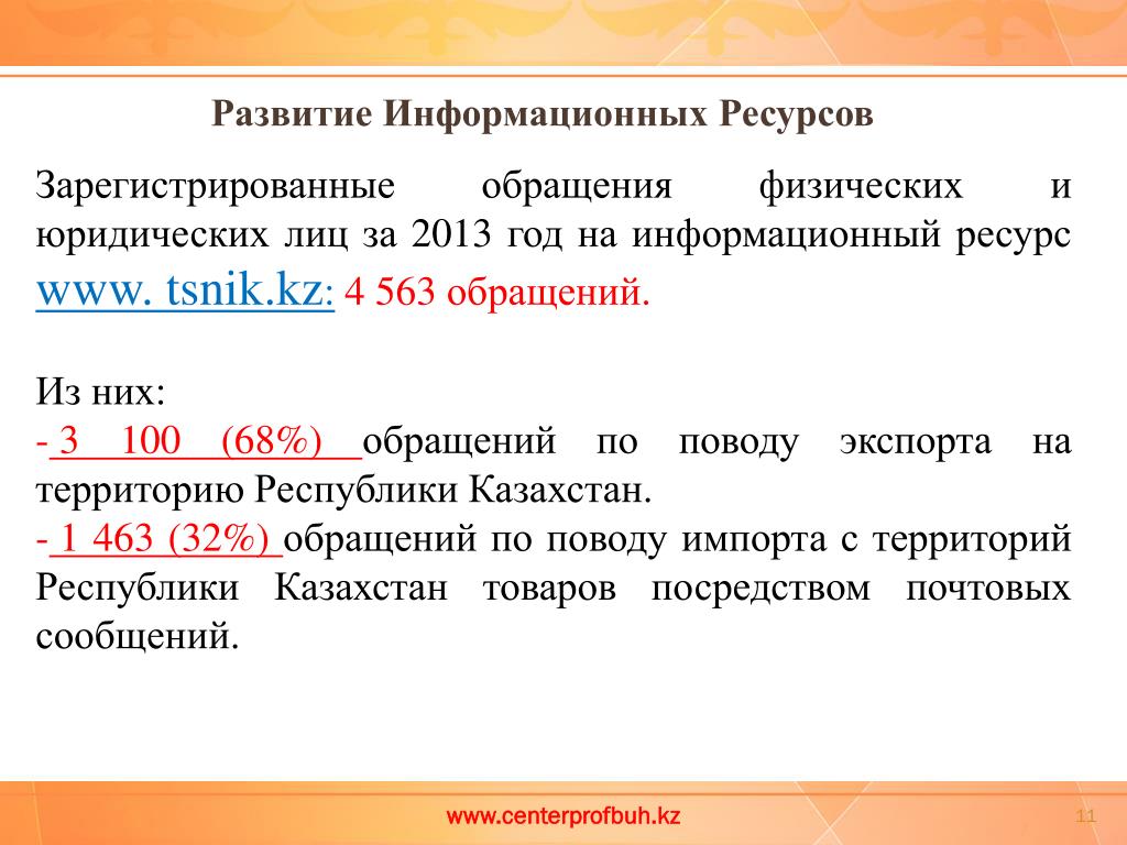 Зарегистрированные обращения физических и юридических лиц за 2013 год на информационный ресурс www. tsnik.kz: 4 563 обращений. Из них: • 3 100 (68%) обращений по поводу экспорта на территорию Республики Казахстан. • 1 463 (32%) обращений по поводу импорта с территорий Республики Казахстан товаров посредством почтовых сообщений. Развитие Информационных Ресурсов www.centerprofbuh.kz