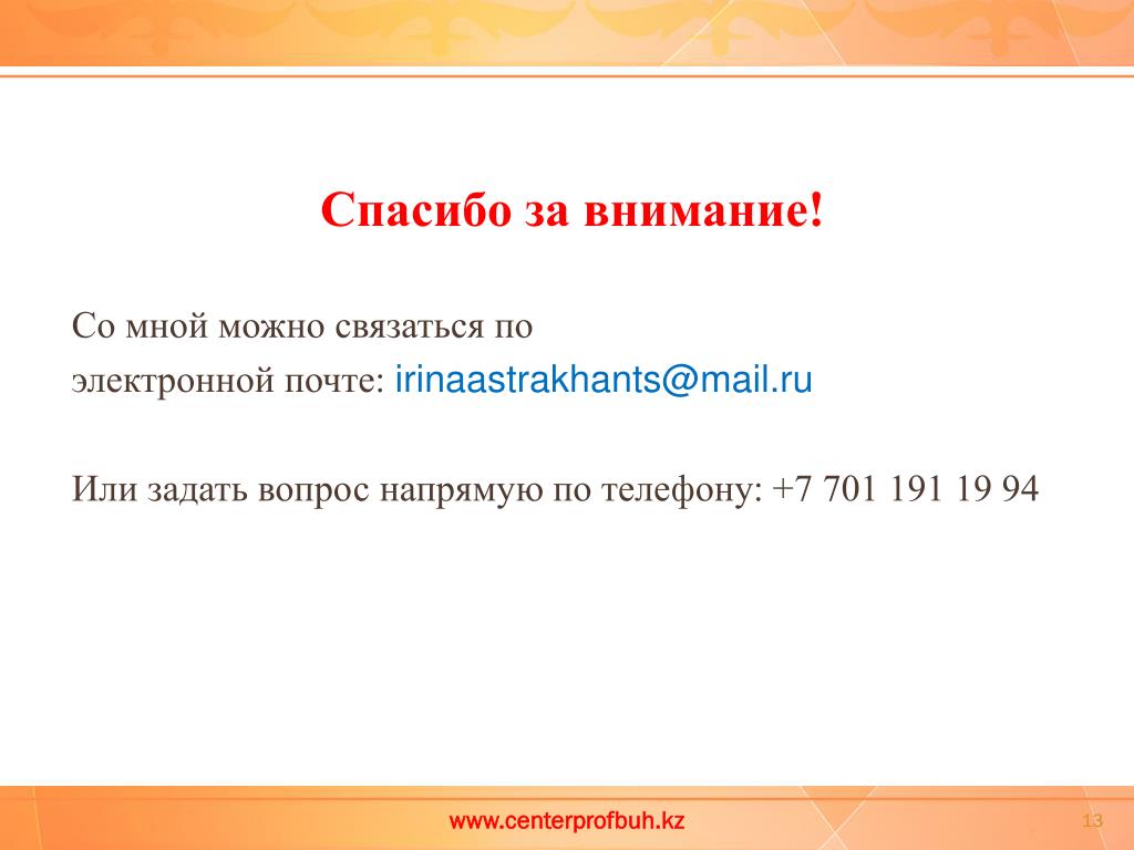 Спасибо за внимание! Со мной можно связаться по электронной почте: irinaastrakhants@mail.ru Или задать вопрос напрямую по телефону: +7 701 191 19 94 www.centerprofbuh.kz