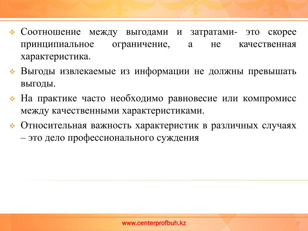 Соотношение между выгодами и затратами- это скорее принципиальное ограничение, а не качественная характеристика. • Выгоды извлекаемые из информации не должны превышать выгоды. • На практике часто необходимо равновесие или компромисс между качественными характеристиками. • Относительная важность характеристик в различных случаях – это дело профессионального суждения www.centerprofbuh.kz