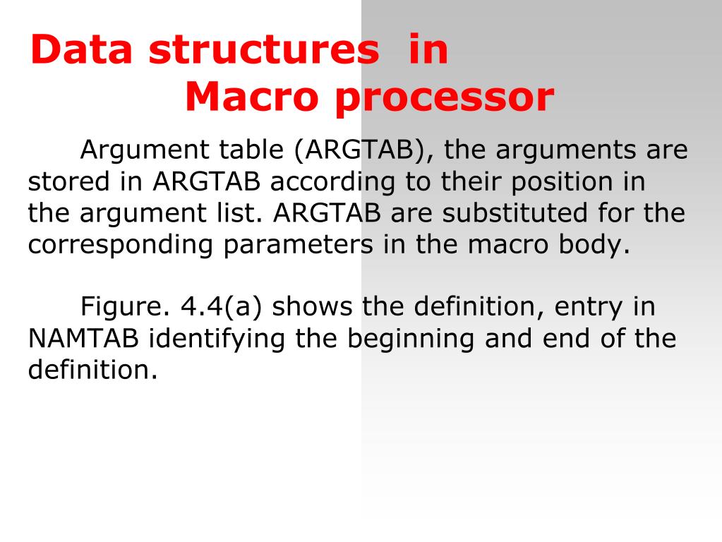 Datastructures in Macroprocessor Argument table (ARGTAB), the arguments are stored in ARGTAB according to their position in the argument list. ARGTAB are substituted for the corresponding parameters in the macro body. Figure. 4.4(a) shows the definition, entry in NAMTAB identifying the beginning and end of the definition.