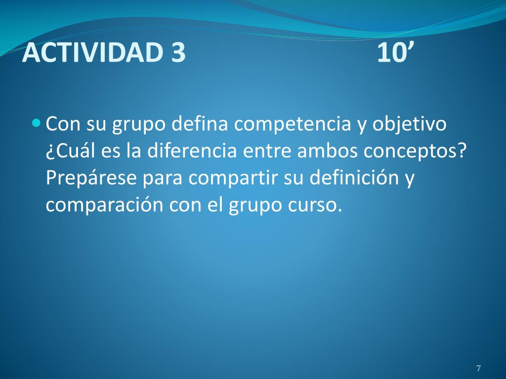 ACTIVIDAD 3 10’ • Con su grupo defina competencia y objetivo ¿Cuál es la diferencia entre ambos conceptos? Prepárese para compartir su definición y comparación con el grupo curso.