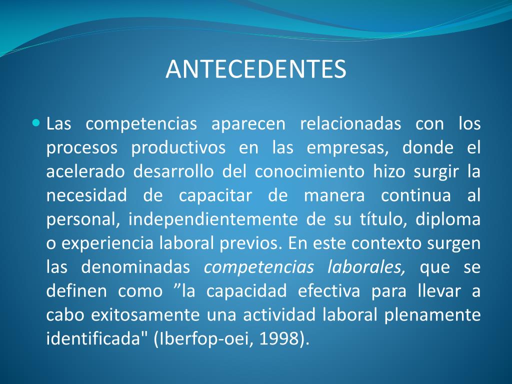 ANTECEDENTES • Las competencias aparecen relacionadas con los procesos productivos en las empresas, donde el acelerado desarrollo del conocimiento hizo surgir la necesidad de capacitar de manera continua al personal, independientemente de su título, diploma o experiencia laboral previos. En este contexto surgen las denominadas competencias laborales, que se definen como ”la capacidad efectiva para llevar a cabo exitosamente una actividad laboral plenamente identificada" (Iberfop-oei, 1998).