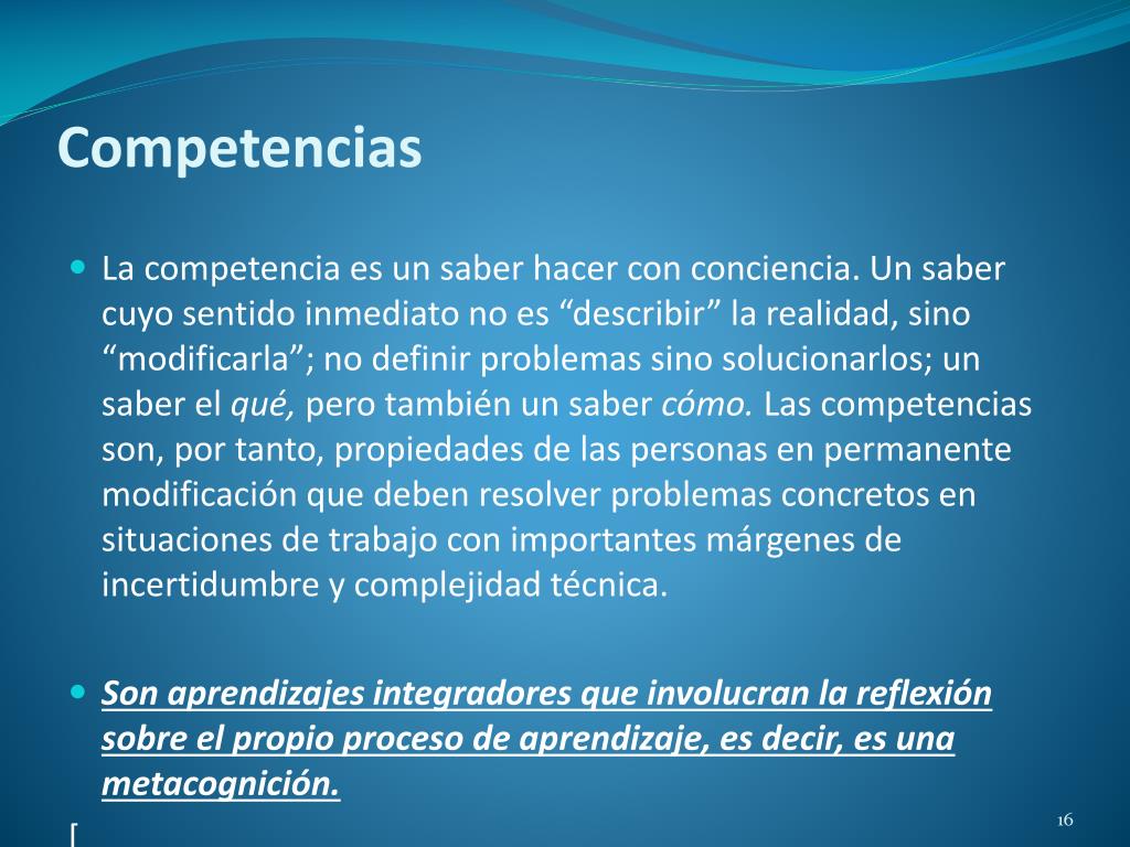 Competencias • La competencia es un saber hacer con conciencia. Un saber cuyo sentido inmediato no es “describir” la realidad, sino “modificarla”; no definir problemas sino solucionarlos; un saber el qué, pero también un saber cómo. Las competencias son, por tanto, propiedades de las personas en permanente modificación que deben resolver problemas concretos en situaciones de trabajo con importantes márgenes de incertidumbre y complejidad técnica. • Son aprendizajes integradores que involucran la reflexión sobre el propio proceso de aprendizaje, es decir, es una metacognición. [