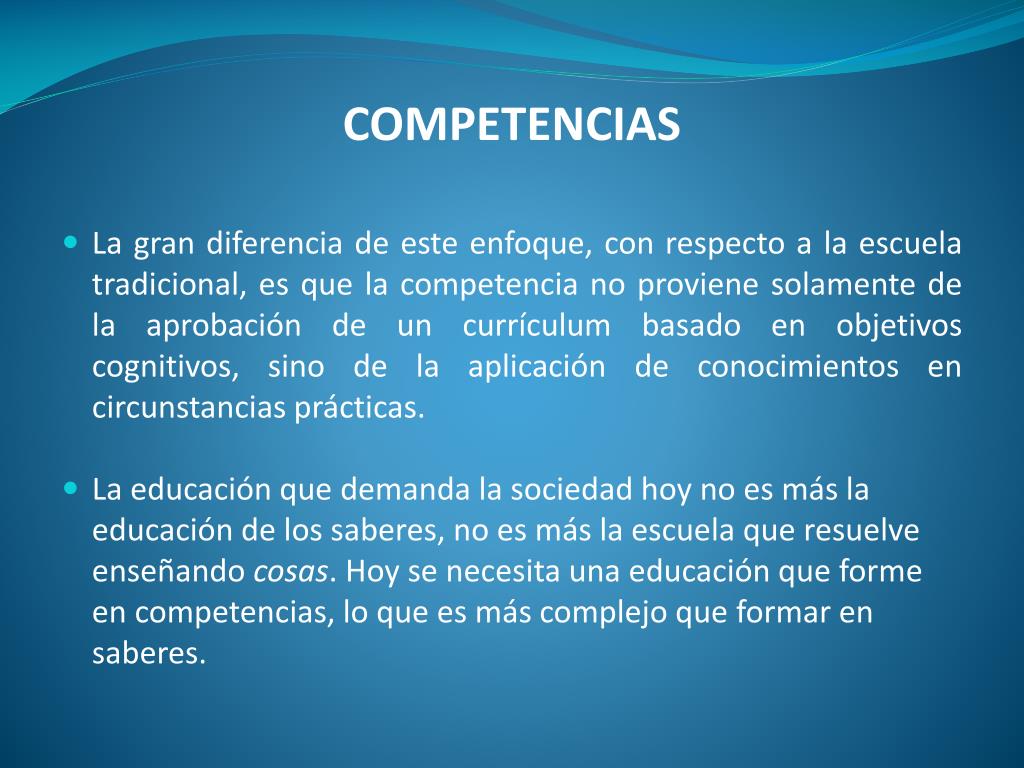COMPETENCIAS • La gran diferencia de este enfoque, con respecto a la escuela tradicional, es que la competencia no proviene solamente de la aprobación de un currículum basado en objetivos cognitivos, sino de la aplicación de conocimientos en circunstancias prácticas. • La educación que demanda la sociedad hoy no es más la educación de los saberes, no es más la escuela que resuelve enseñando cosas. Hoy se necesita una educación que forme en competencias, lo que es más complejo que formar en saberes.