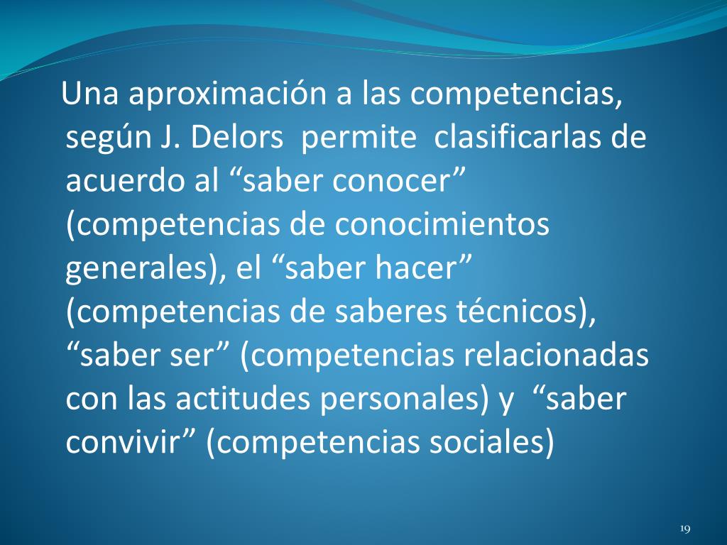 Una aproximación a las competencias, según J. Delors permite clasificarlas de acuerdo al “saber conocer” (competencias de conocimientos generales), el “saber hacer” (competencias de saberes técnicos), “saber ser” (competencias relacionadas con las actitudes personales) y “saber convivir” (competencias sociales)