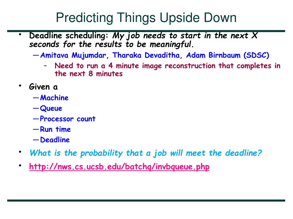 Predicting Things Upside Down • Deadline scheduling: My job needs to start in the next X seconds for the results to be meaningful. • Amitava Mujumdar, Tharaka Devaditha, Adam Birnbaum (SDSC) • Need to run a 4 minute image reconstruction that completes in the next 8 minutes • Given a • Machine • Queue • Processor count • Run time • Deadline • What is the probability that a job will meet the deadline? • http://nws.cs.ucsb.edu/batchq/invbqueue.php