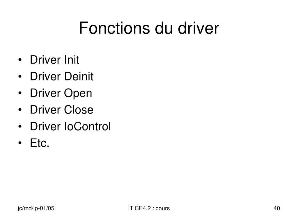 Fonctions du driver • Driver Init • Driver Deinit • Driver Open • Driver Close • Driver IoControl • Etc. IT CE4.2 : cours