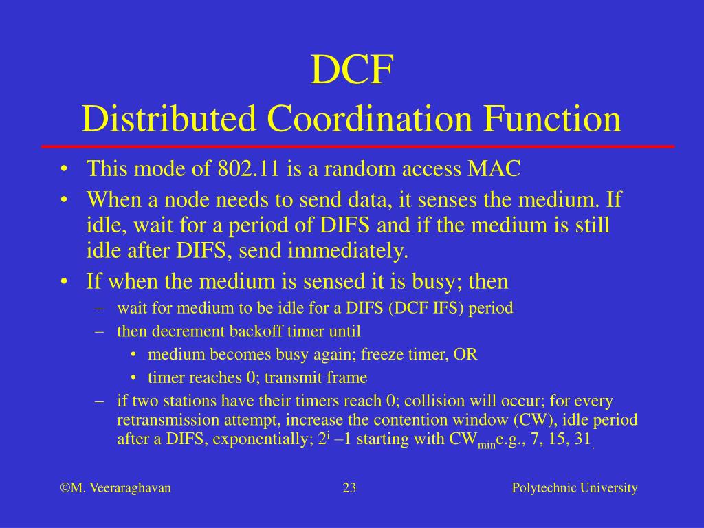 DCFDistributed Coordination Function • This mode of 802.11 is a random access MAC • When a node needs to send data, it senses the medium. If idle, wait for a period of DIFS and if the medium is still idle after DIFS, send immediately. • If when the medium is sensed it is busy; then • wait for medium to be idle for a DIFS (DCF IFS) period • then decrement backoff timer until • medium becomes busy again; freeze timer, OR • timer reaches 0; transmit frame • if two stations have their timers reach 0; collision will occur; for every retransmission attempt, increase the contention window (CW), idle period after a DIFS, exponentially; 2i –1 starting with CWmine.g., 7, 15, 31.