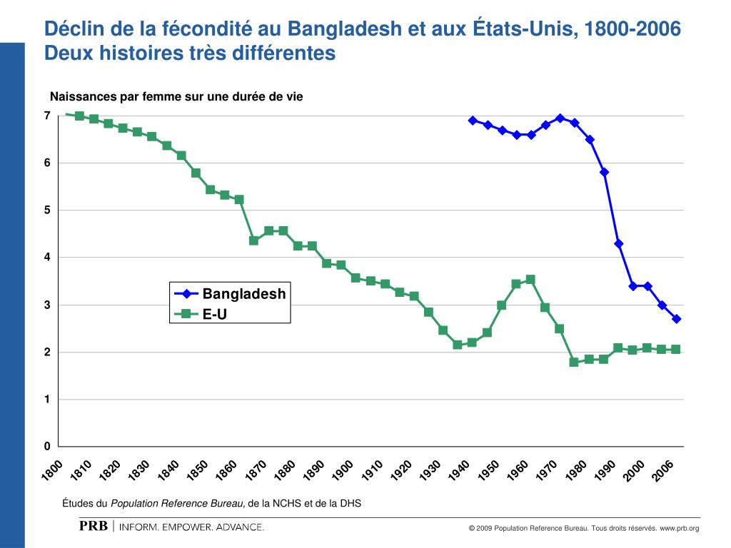 Déclin de la fécondité au Bangladesh et aux États-Unis, 1800-2006 Deux histoires très différentes Naissances par femme sur une durée de vie Études du Population Reference Bureau, de la NCHS et de la DHS