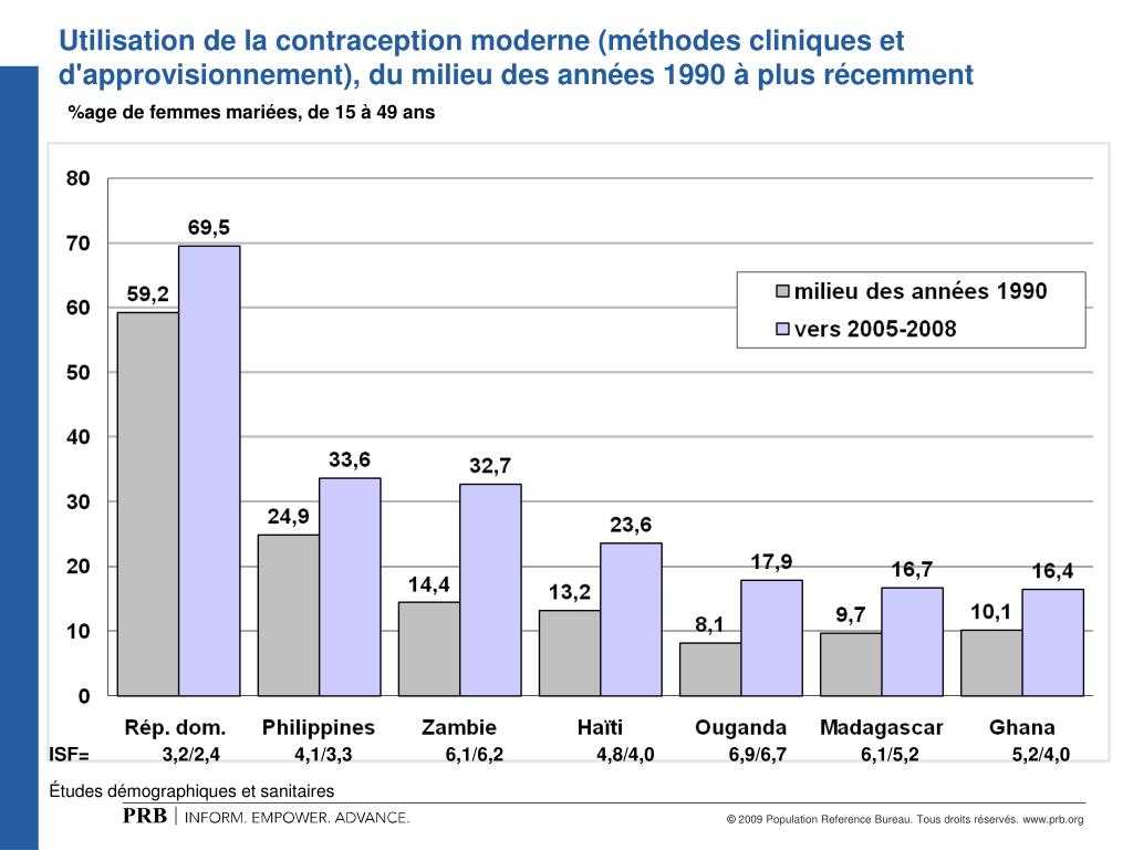Utilisation de la contraception moderne (méthodes cliniques et d'approvisionnement), du milieu des années 1990 à plus récemment %age de femmes mariées, de 15 à 49 ans ISF= 3,2/2,4 4,1/3,3 6,1/6,2 4,8/4,0 6,9/6,7 6,1/5,2 5,2/4,0 Études démographiques et sanitaires