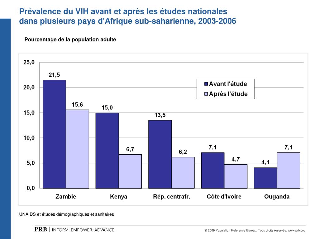 Prévalence du VIH avant et après les études nationales dans plusieurs pays d'Afrique sub-saharienne, 2003-2006 Pourcentage de la population adulte UNAIDS et études démographiques et sanitaires