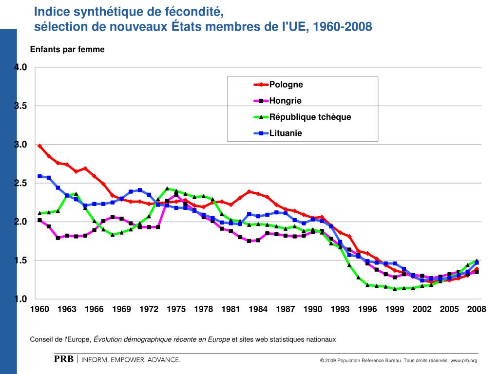 Indice synthétique de fécondité, sélection de nouveaux États membres de l'UE, 1960-2008 Enfants par femme Conseil de l'Europe, Évolution démographique récente en Europe et sites web statistiques nationaux