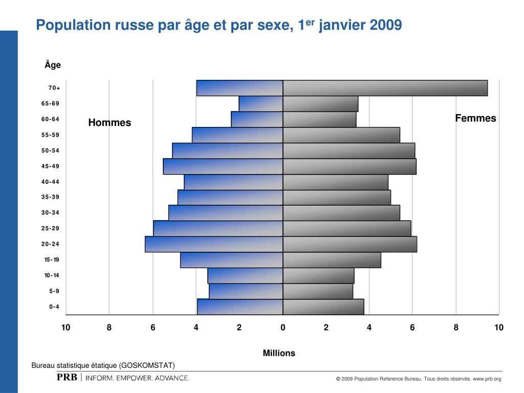 Population russe par âge et par sexe, 1er janvier 2009 Âge Femmes Hommes Millions Bureau statistique étatique (GOSKOMSTAT)