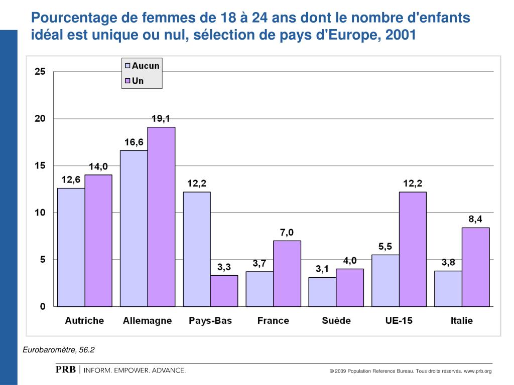 Pourcentage de femmes de 18 à 24 ans dont le nombre d'enfants idéal est unique ou nul, sélection de pays d'Europe, 2001 Eurobaromètre, 56.2
