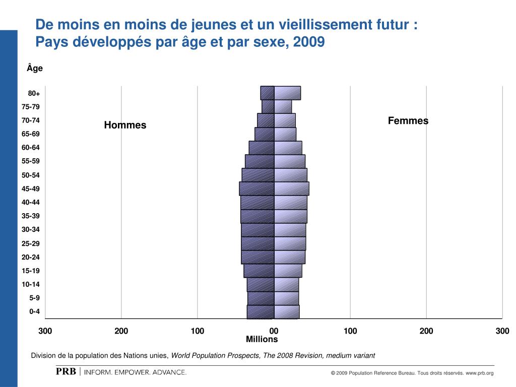 De moins en moins de jeunes et un vieillissement futur : Pays développés par âge et par sexe, 2009 Âge Femmes Hommes Millions Division de la population des Nations unies, World Population Prospects, The 2008 Revision, medium variant