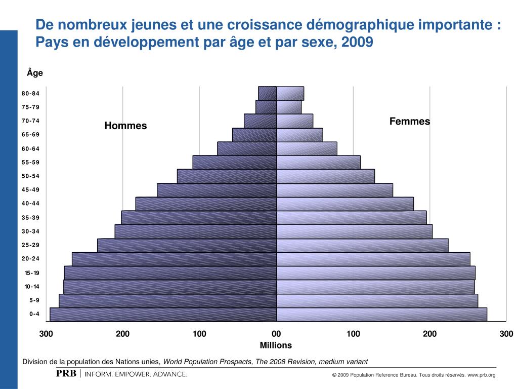 De nombreux jeunes et une croissance démographique importante : Pays en développement par âge et par sexe, 2009 Âge Femmes Hommes Millions Division de la population des Nations unies, World Population Prospects, The 2008 Revision, medium variant