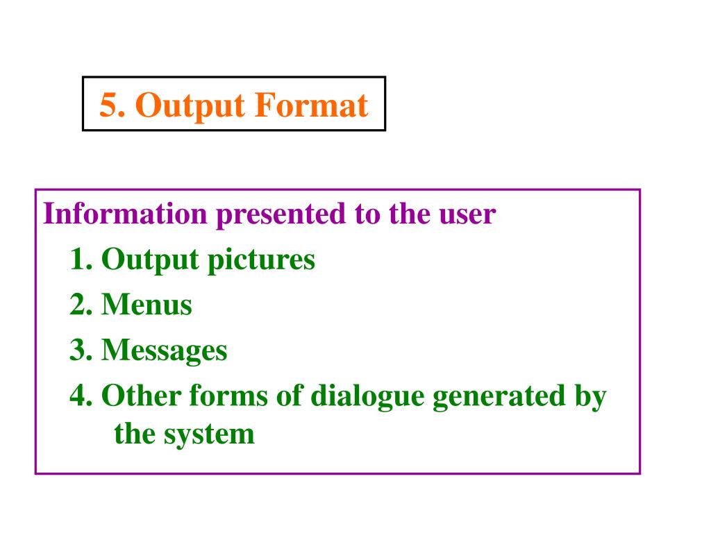 5. Output Format Information presented to the user 1. Output pictures 2. Menus 3. Messages 4. Other forms of dialogue generated by the system