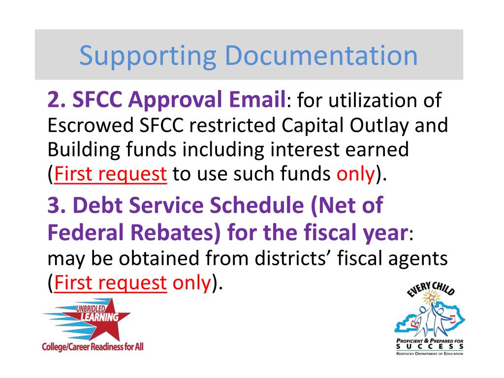 Supporting Documentation Supporting Documentation 2. SFCC Approval Email: for utilization of Escrowed SFCC restricted Capital Outlay and Building funds including interest earned (First request to use such funds only). 3. Debt Service Schedule (Net of Federal Rebates) for the fiscal year: may be obtained from districts’ fiscal agents (First request only).