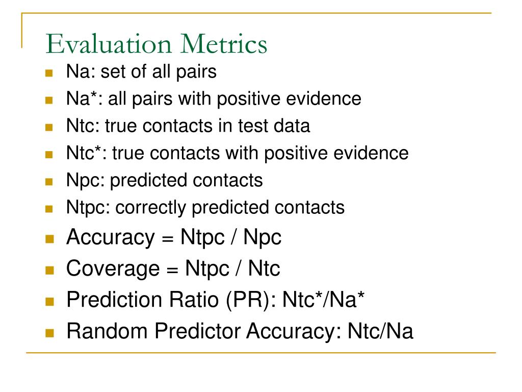 Evaluation Metrics • Na: set of all pairs • Na*: all pairs with positive evidence • Ntc: true contacts in test data • Ntc*: true contacts with positive evidence • Npc: predicted contacts • Ntpc: correctly predicted contacts • Accuracy = Ntpc / Npc • Coverage = Ntpc / Ntc • Prediction Ratio (PR): Ntc*/Na* • Random Predictor Accuracy: Ntc/Na