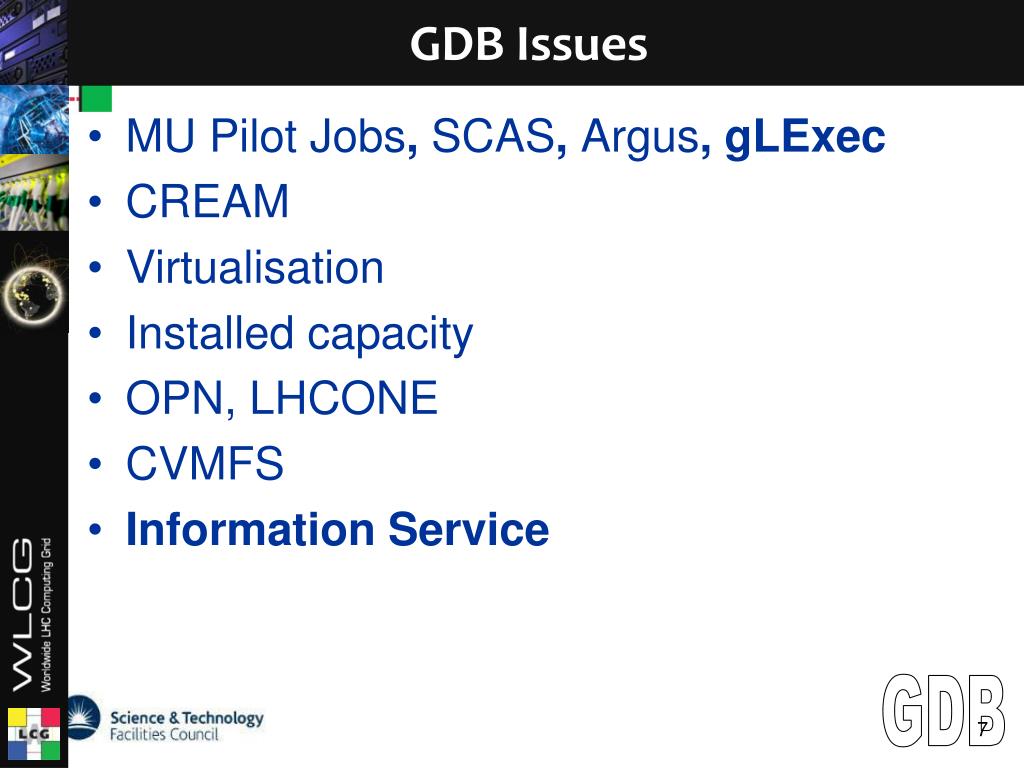 GDB Issues • MU Pilot Jobs, SCAS, Argus, gLExec • CREAM • Virtualisation • Installed capacity • OPN, LHCONE • CVMFS • Information Service