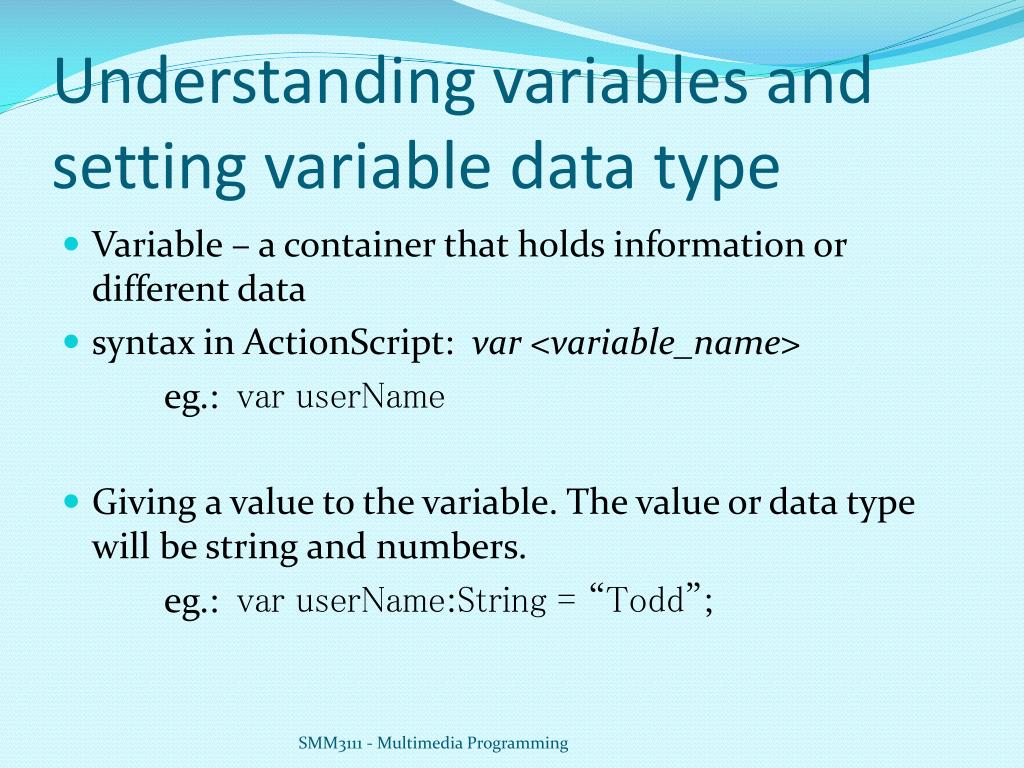Understanding variables and setting variable data type • Variable – a container that holds information or different data • syntax in ActionScript: var <variable_name> eg.: var userName • Giving a value to the variable. The value or data type will be string and numbers. eg.: var userName:String = “Todd”; SMM3111 - Multimedia Programming