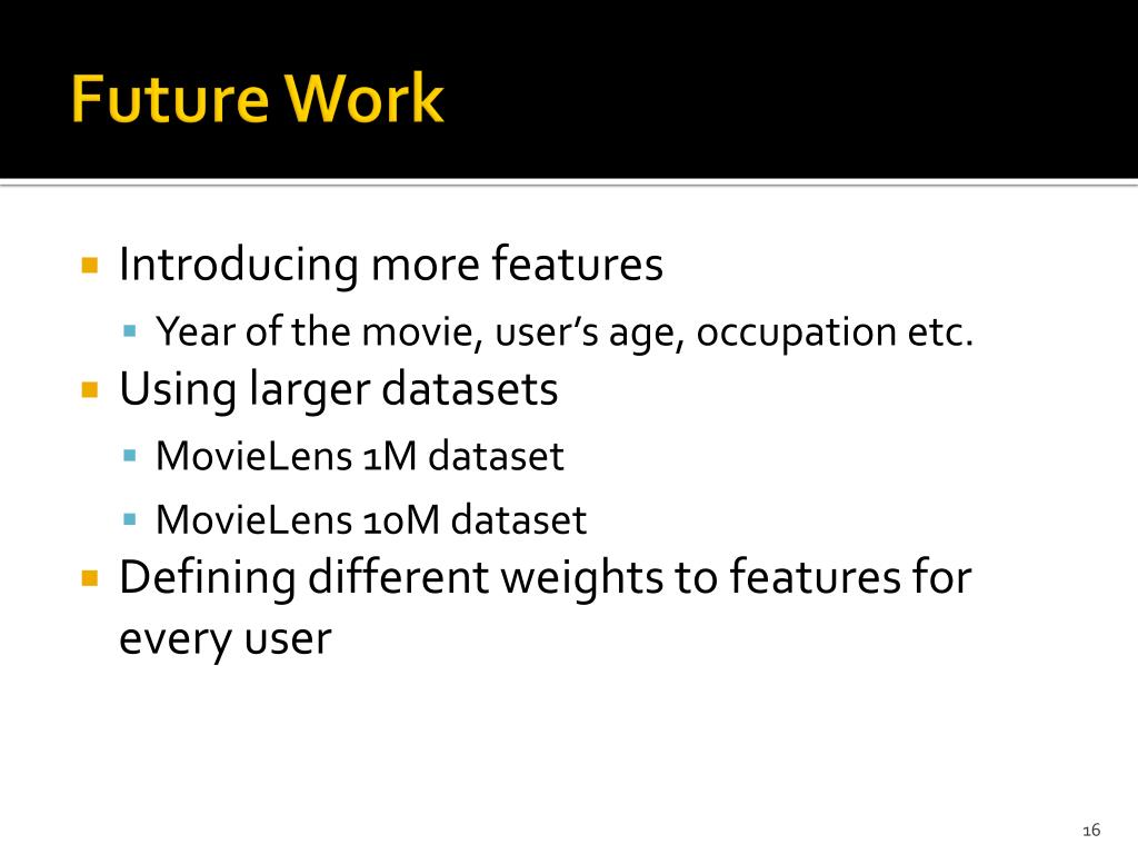Future Work • Introducing more features • Year of the movie, user’s age, occupation etc. • Using larger datasets • MovieLens 1M dataset • MovieLens 10M dataset • Defining different weights to features for every user