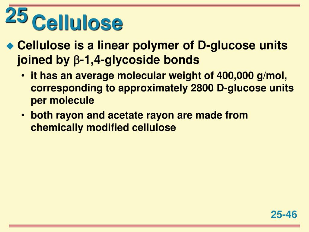 Cellulose • Cellulose is a linear polymer of D-glucose units joined by -1,4-glycoside bonds • it has an average molecular weight of 400,000 g/mol, corresponding to approximately 2800 D-glucose units per molecule • both rayon and acetate rayon are made from chemically modified cellulose