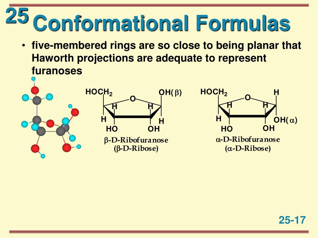 Conformational Formulas • five-membered rings are so close to being planar that Haworth projections are adequate to represent furanoses