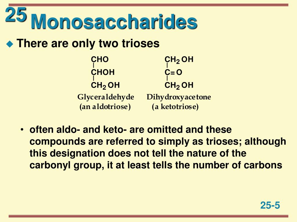 Monosaccharides • There are only two trioses • often aldo- and keto- are omitted and these compounds are referred to simply as trioses; although this designation does not tell the nature of the carbonyl group, it at least tells the number of carbons
