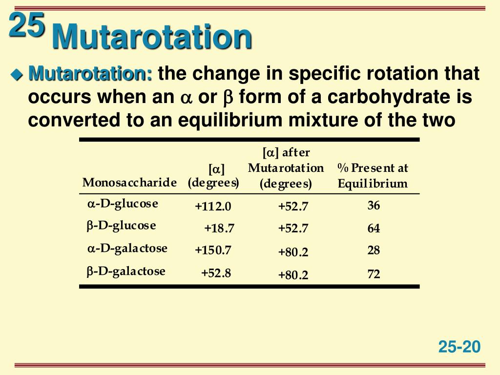 Mutarotation • Mutarotation: the change in specific rotation that occurs when an or form of a carbohydrate is converted to an equilibrium mixture of the two