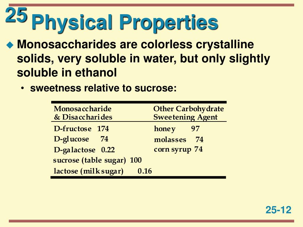 Physical Properties • Monosaccharides are colorless crystalline solids, very soluble in water, but only slightly soluble in ethanol • sweetness relative to sucrose: