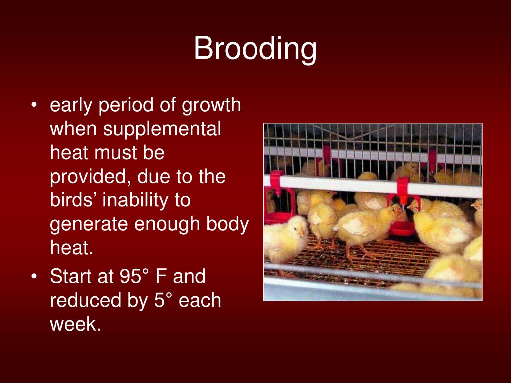 Brooding • early period of growth when supplemental heat must be provided, due to the birds’ inability to generate enough body heat. • Start at 95° F and reduced by 5° each week.