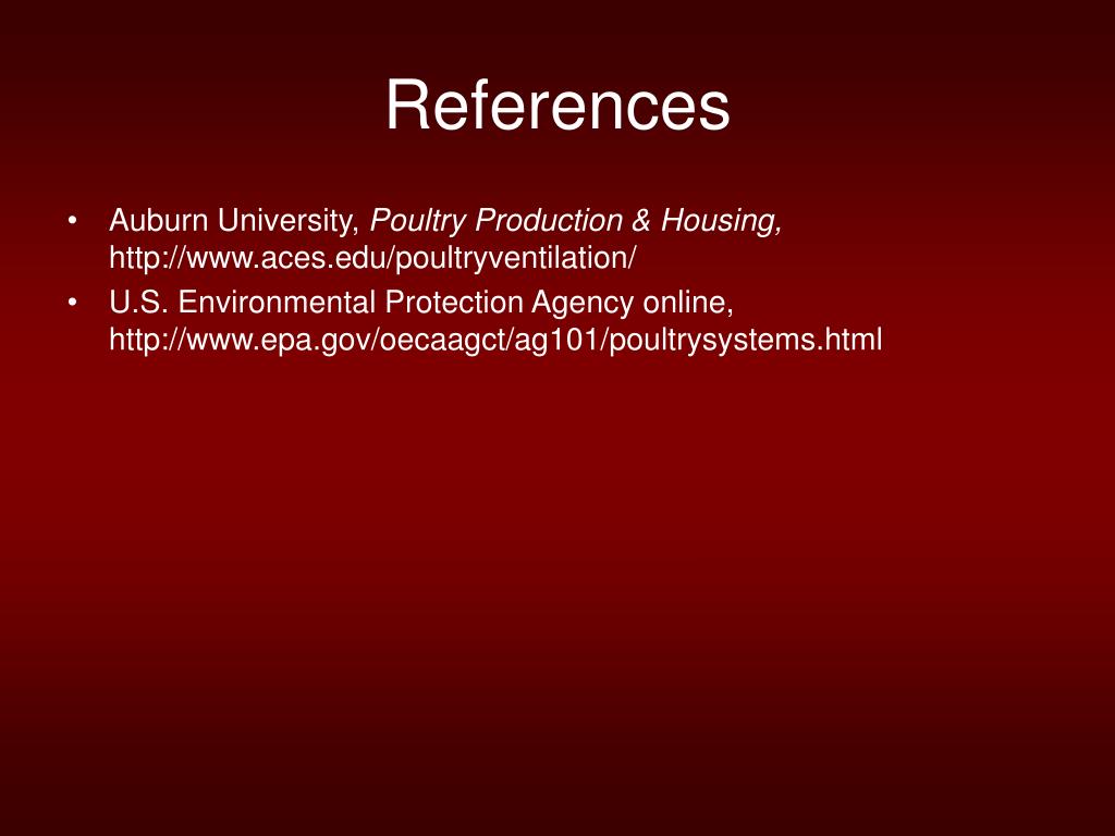 References • Auburn University, Poultry Production & Housing, http://www.aces.edu/poultryventilation/ • U.S. Environmental Protection Agency online, http://www.epa.gov/oecaagct/ag101/poultrysystems.html