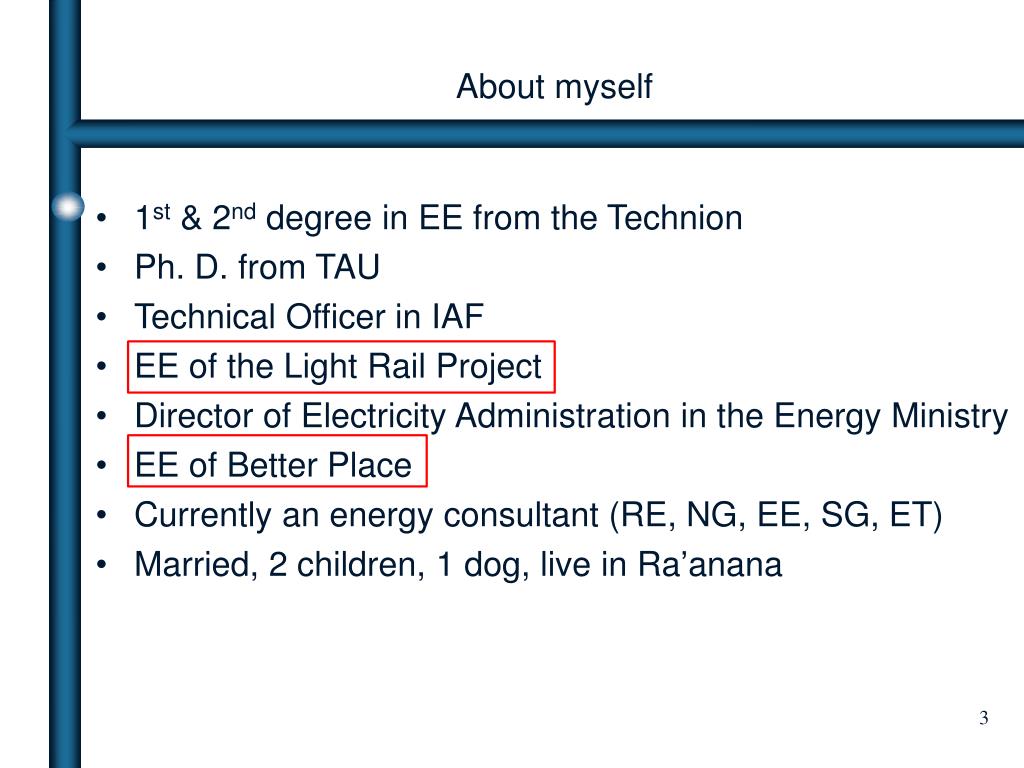 About myself • 1st & 2nd degree in EE from the Technion • Ph. D. from TAU • Technical Officer in IAF • EE of the Light Rail Project • Director of Electricity Administration in the Energy Ministry • EE of Better Place • Currently an energy consultant (RE, NG, EE, SG, ET) • Married, 2 children, 1 dog, live in Ra’anana