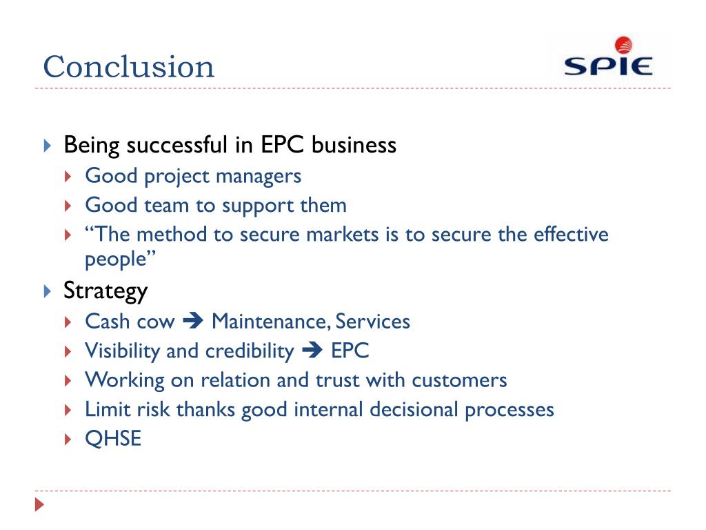 Conclusion • Being successful in EPC business • Good project managers • Good team to support them • “The method to secure markets is to secure the effective people” • Strategy • Cash cow Maintenance, Services • Visibility and credibility EPC • Working on relation and trust with customers • Limit risk thanks good internal decisional processes • QHSE