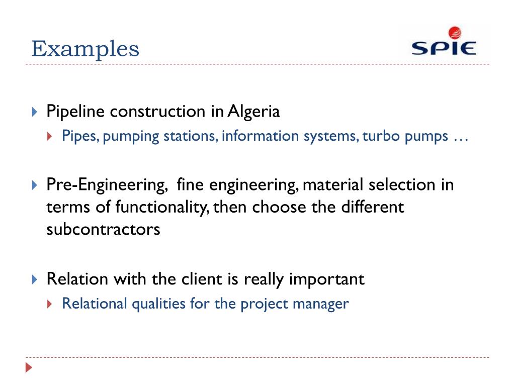 Examples • Pipeline construction in Algeria • Pipes, pumping stations, information systems, turbo pumps … • Pre-Engineering, fine engineering, material selection in terms of functionality, then choose the different subcontractors • Relation with the client is really important • Relational qualities for the project manager