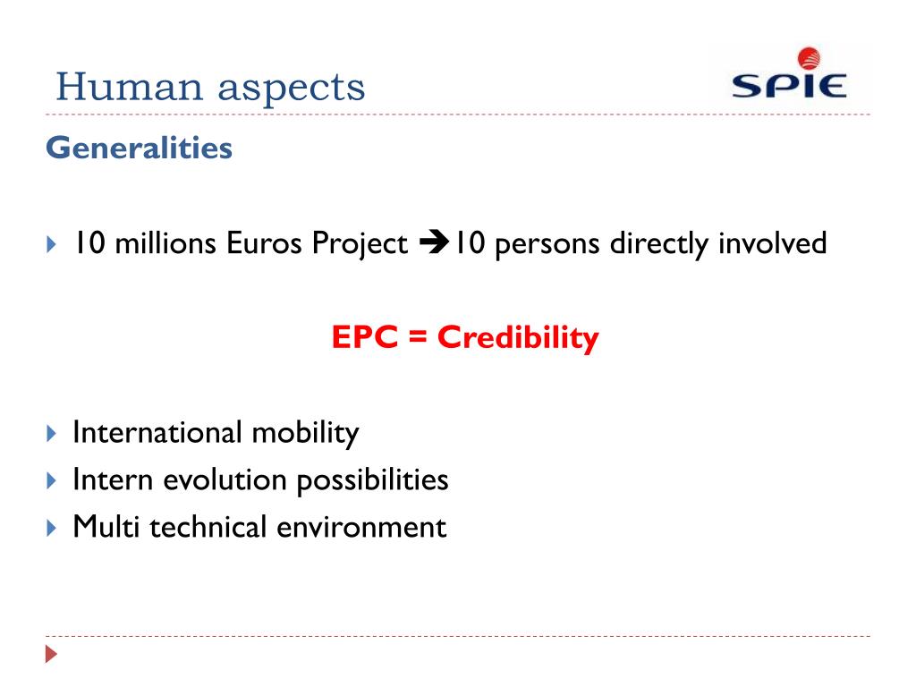 Human aspects Generalities • 10 millions Euros Project10 persons directly involved EPC = Credibility • International mobility • Intern evolution possibilities • Multi technical environment