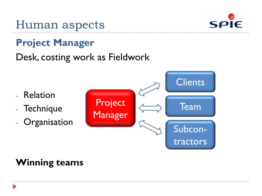 Human aspects Project Manager Desk, costing work as Fieldwork • Relation • Technique • Organisation Winning teams Clients Project Manager Team Subcon-tractors
