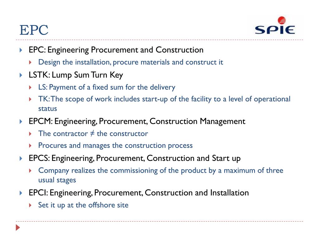 EPC – SPIE Oil & Gas Services. Bonsai Team – 12.01.2010. Summary. 1°) EPC 2°) SPIE Oil & Gas 3°) Strategy 4°) Example 5°) Human aspects. EPC. EPC: Engineering Procurement and Construction Design the installation, procure materials and construct it LSTK: Lump Sum Turn Key