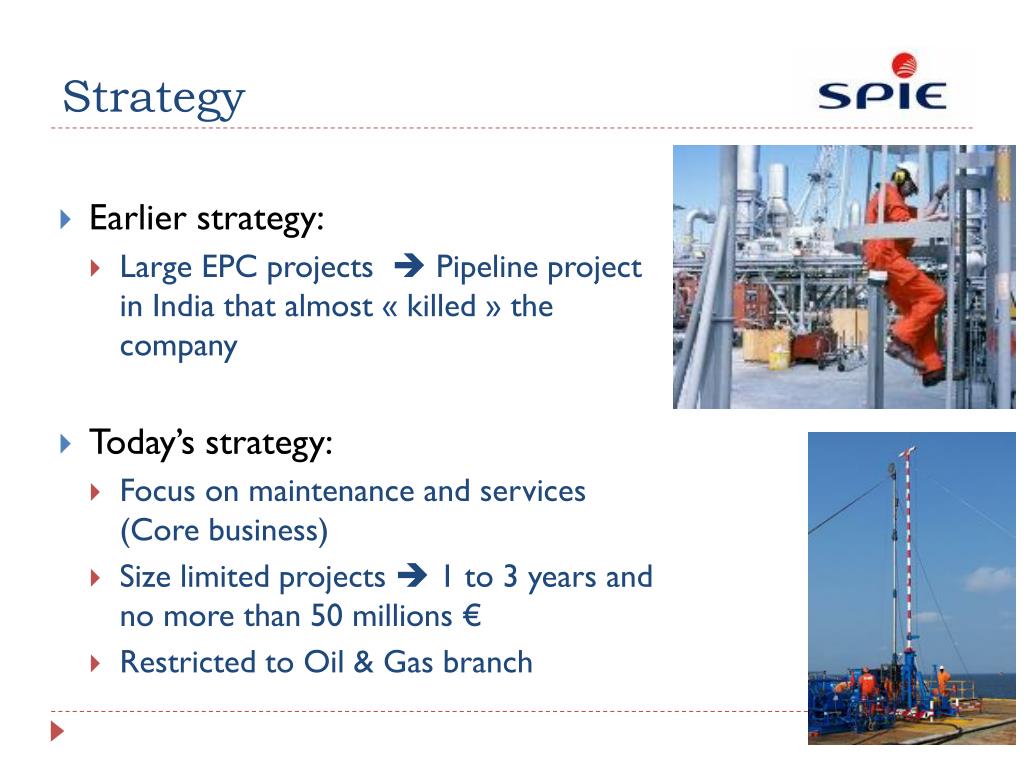 Strategy • Earlier strategy: • Large EPC projects Pipeline project in India that almost « killed » the company • Today’s strategy: • Focus on maintenance and services (Core business) • Size limited projects 1 to 3 years and no more than 50 millions € • Restricted to Oil & Gas branch