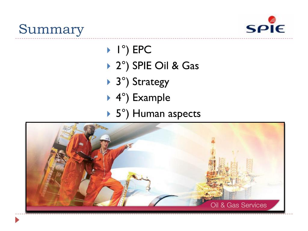 Summary • 1°) EPC • 2°) SPIE Oil & Gas • 3°) Strategy • 4°) Example • 5°) Human aspects