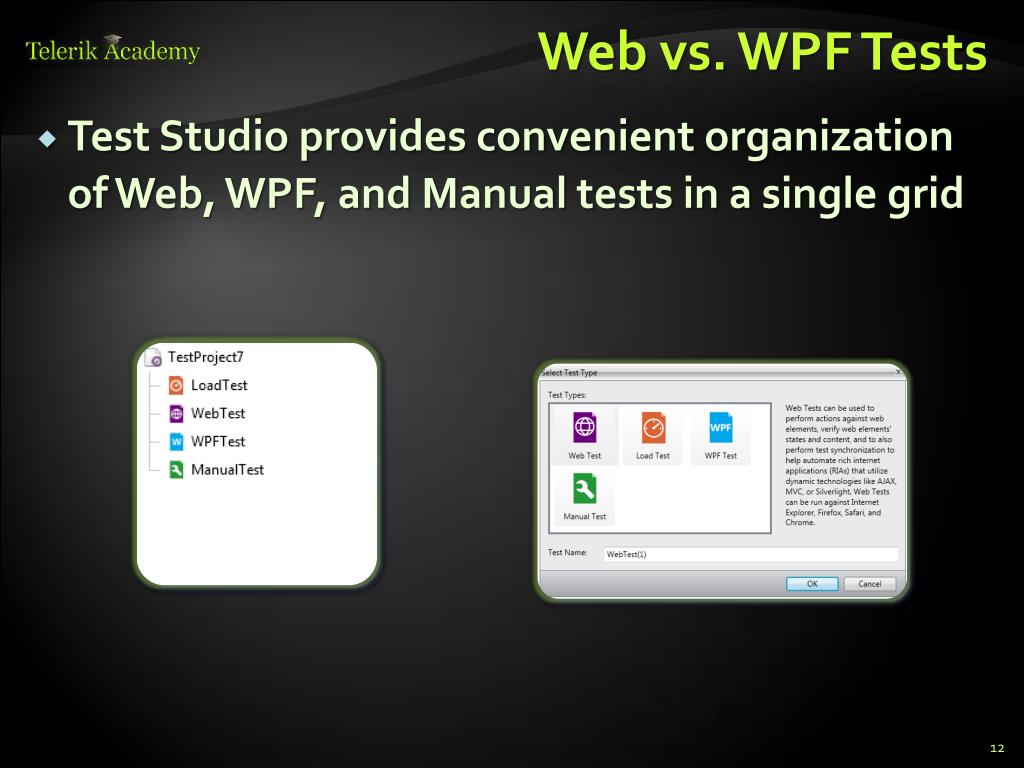 Telerik Test Studio • Telerik Test Studio is an automated testing tool • Offers an intuitive, codeless and productive way to test any web or WPF desktop application • Test recording is performed extremely easy • In the same manner as an end user would accomplish these same tasks • Web test recording is performed directly in the browser