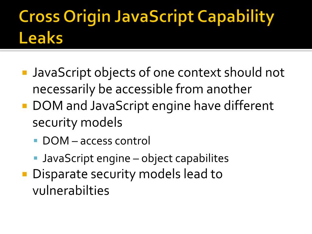 Cross Origin JavaScript Capability Leaks • JavaScript objects of one context should not necessarily be accessible from another • DOM and JavaScript engine have different security models • DOM – access control • JavaScript engine – object capabilites • Disparate security models lead to vulnerabilties