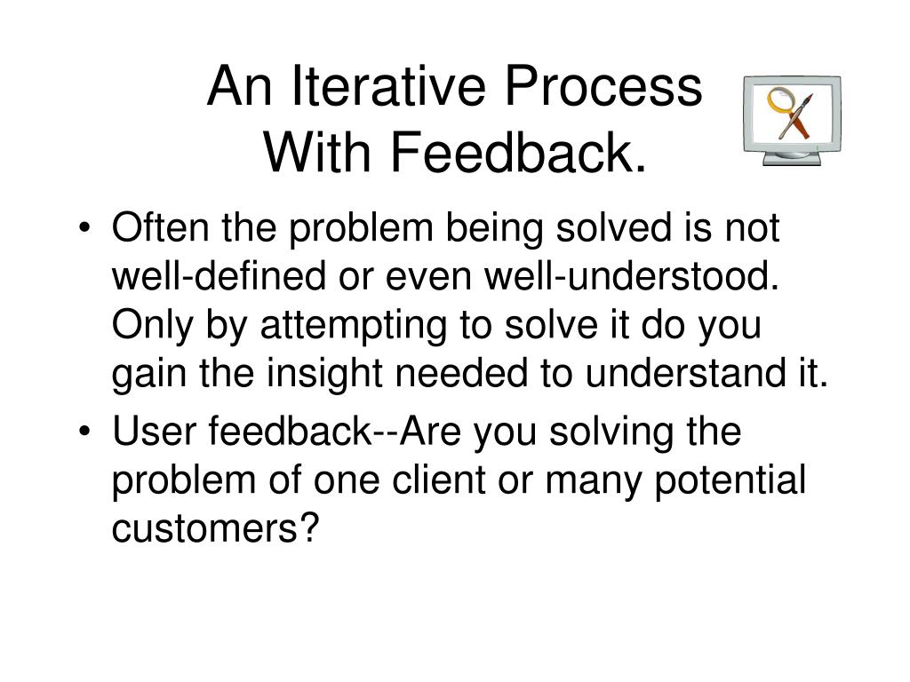 An Iterative ProcessWith Feedback. • Often the problem being solved is not well-defined or even well-understood. Only by attempting to solve it do you gain the insight needed to understand it. • User feedback--Are you solving the problem of one client or many potential customers?