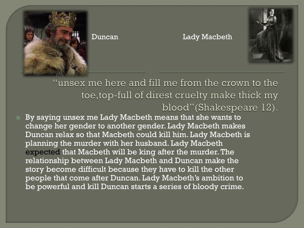 “unsex me here and fill me from the crown to the toe,top-full of direst cruelty make thick myblood”(Shakespeare 12). Duncan Lady Macbeth • By saying unsex me Lady Macbeth means that she wants to change her gender to another gender. Lady Macbeth makes Duncan relax so that Macbeth could kill him. Lady Macbeth is planning the murder with her husband. Lady Macbeth expected that Macbeth will be king after the murder. The relationship between Lady Macbeth and Duncan make the story become difficult because they have to kill the other people that come after Duncan. Lady Macbeth’s ambition to be powerful and kill Duncan starts a series of bloody crime.