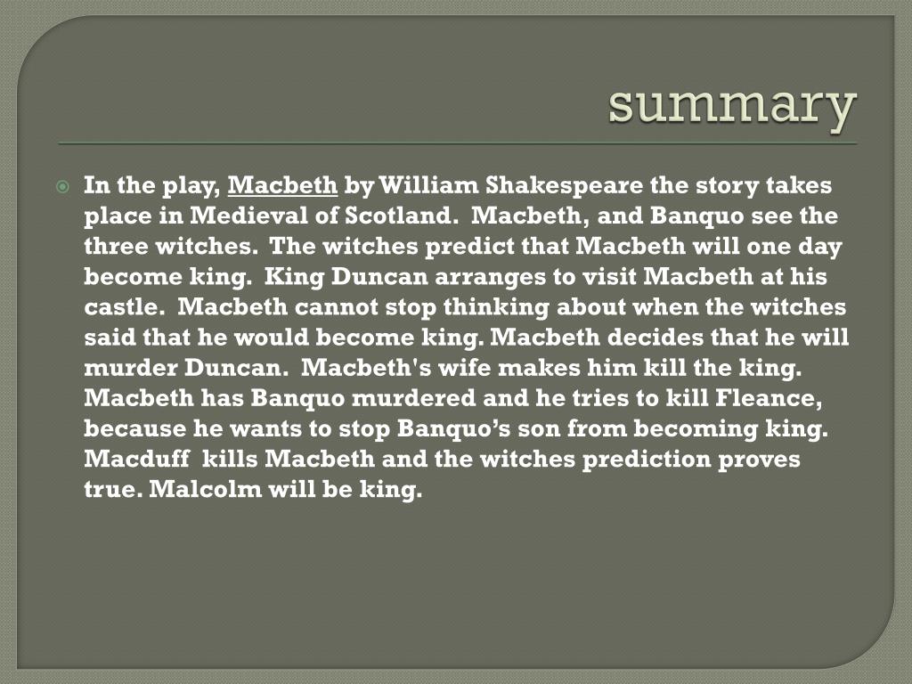 summary In the play, Macbeth by William Shakespeare the story takes place in Medieval of Scotland. Macbeth, and Banquo see the three witches. The witches predict that Macbeth will one day become king. King Duncan arranges to visit Macbeth at his castle. Macbeth cannot stop thinking about when the witches said that he would become king. Macbeth decides that he will murder Duncan. Macbeth's wife makes him kill the king. Macbeth has Banquo murdered and he tries to kill Fleance, because he wants to stop Banquo’s son from becoming king. Macduff kills Macbeth and the witches prediction proves true. Malcolm will be king.